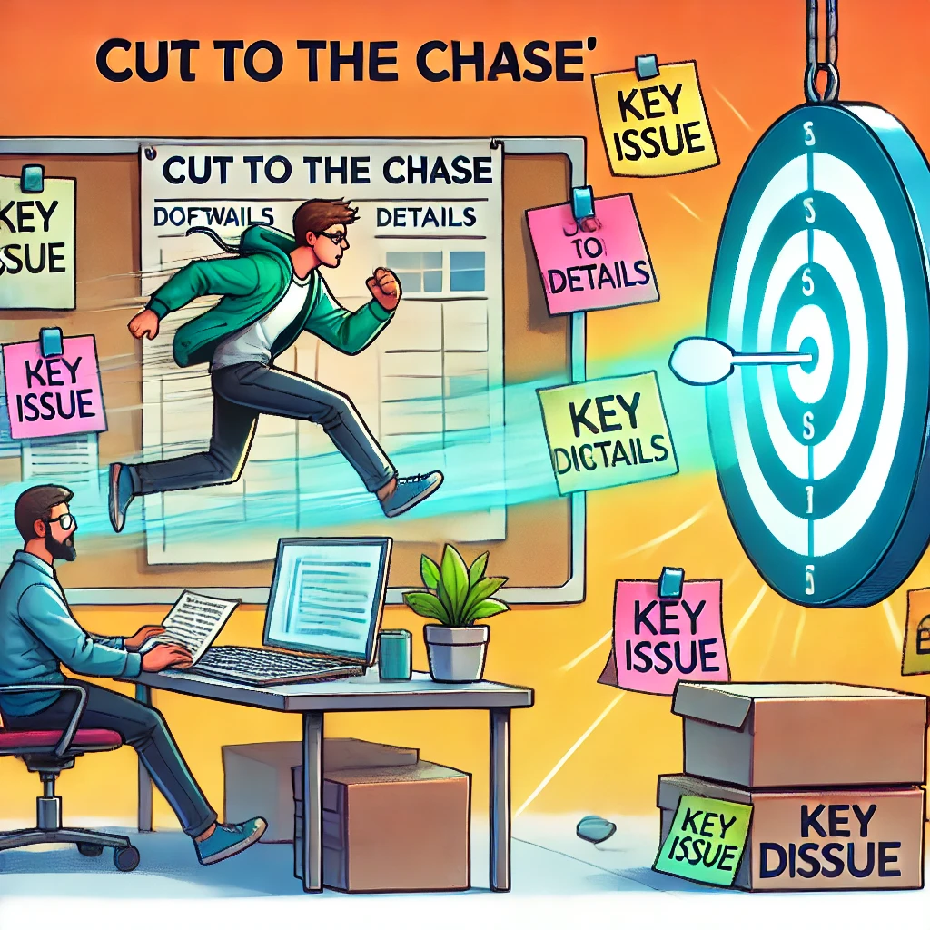"Cut to the Chase"는 "쓸데없는 장면을 잘라내고 클라이맥스로 바로 가다", 즉 "핵심으로 바로 들어가다"라는 뜻입니다. 이는 대화나 작업에서 불필요한 내용을 줄이고 중요한 부분에 집중하자는 메시지를 담고 있습니다.