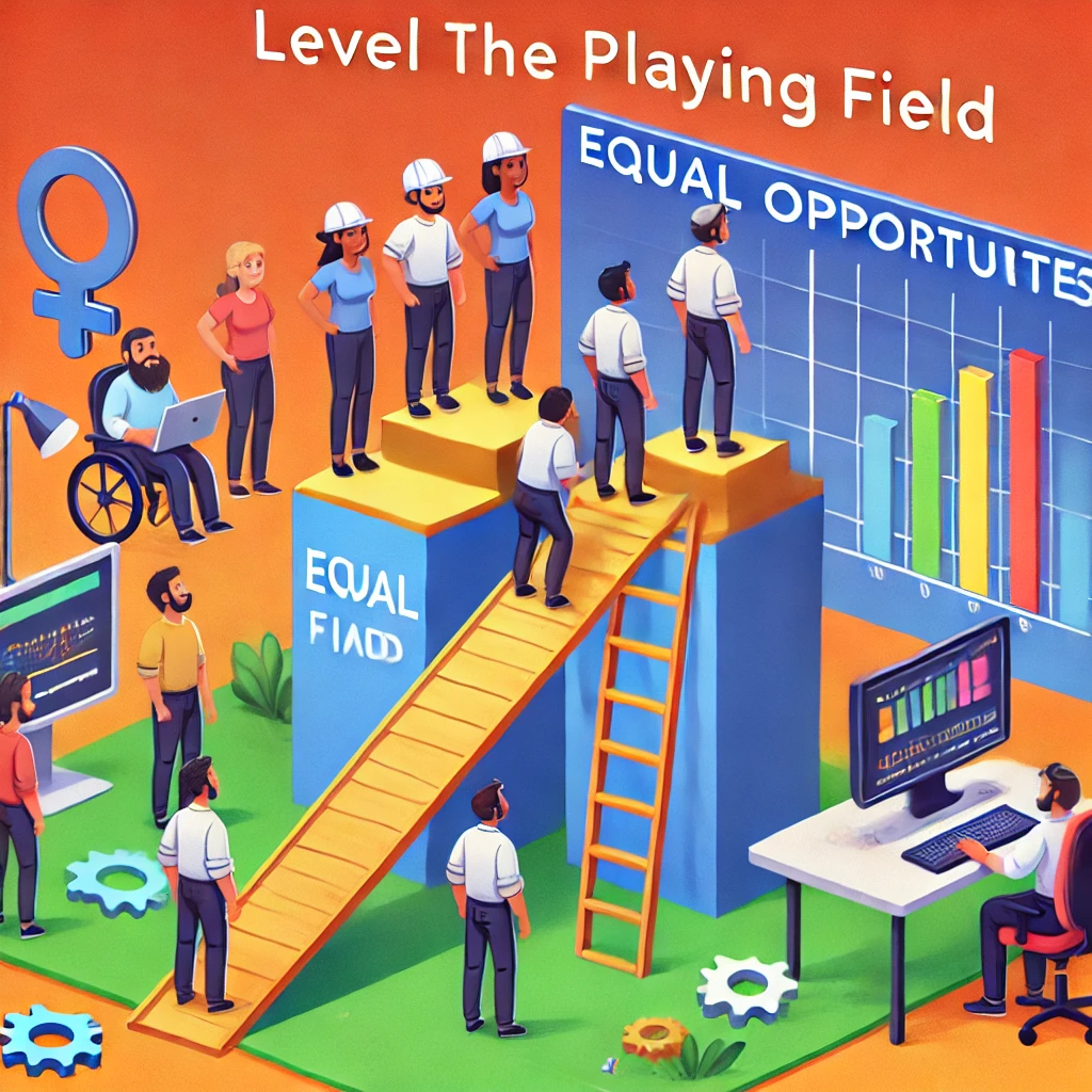 "Level the Playing Field"는 "운동장의 경사를 평평하게 만들다", 즉, "모두가 같은 조건에서 시작할 수 있도록 공정성을 확보하다"는 뜻입니다. 이는 기회와 자원의 불균형을 해소하려는 노력을 강조합니다.