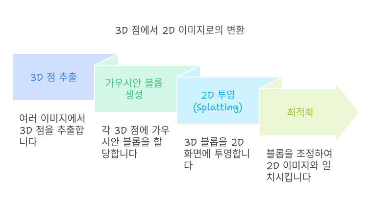 얻어진 3D 점들 각각에 대해 가우시안 형태의 블롭(구름)을 할당합니다. 각 블롭은 위치(중심점), 크기(분산), 모양(등방성 혹은 이방성), 그리고 색상 정보를 가질 수 있습니다. - 2D 투영(Splatting):