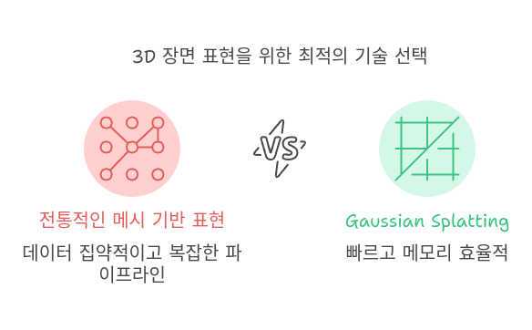 이런 상황 속에서, 더 단순하면서도 효율적인 3D 표현 방법에 대한 요구가 커졌고, 그 대안 중 하나로 ‘Gaussian Splatting’이 등장하게 된 겁니다. 최근 딥러닝과 뉴럴 렌더링(Neural Rendering) 분야의 발전과 함께, 단순히 "점"을 이용한 표현이 아니라 점 주변에 가우시안 형태의 블롭(구름)을 할당하는 방식으로 더 부드럽고 자연스러운 3D 장면 표현이 가능해졌습니다. 그리고 이 방법은 렌더링 속도가 빠르고, 구현 난이도가 낮으며, 메모리 효율성도 좋기 때문에 점점 많은 곳에서 주목받고 있습니다.
