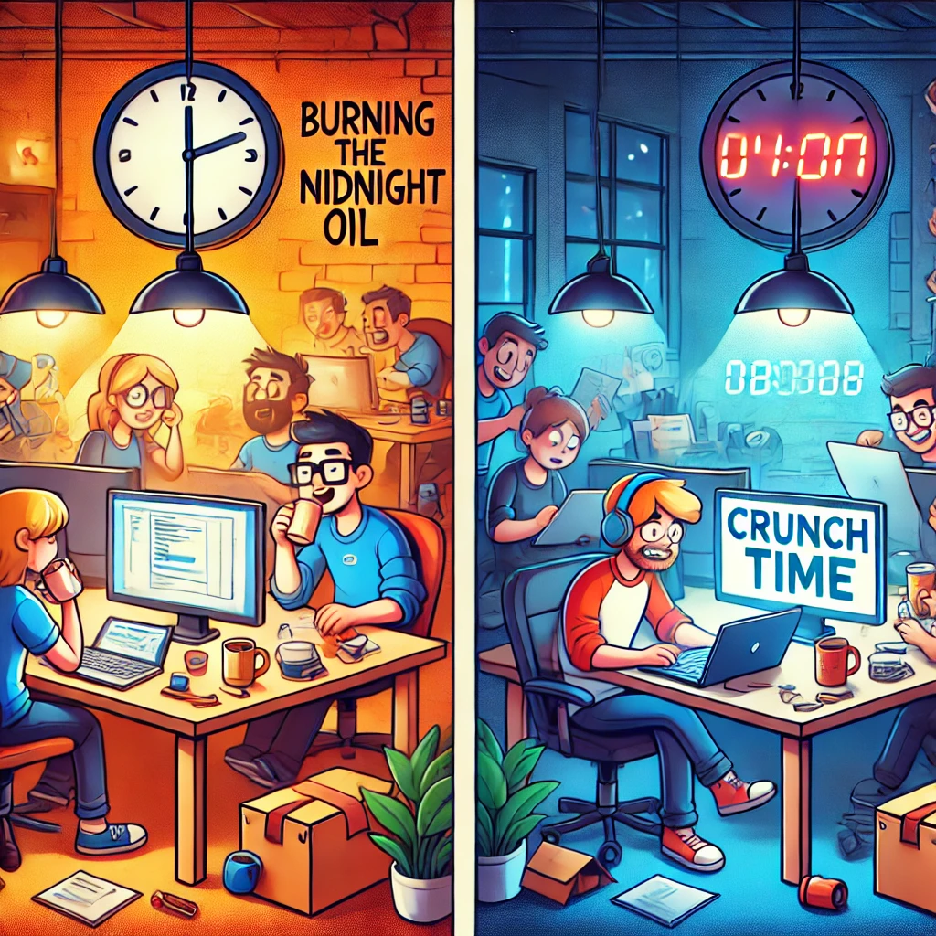 "Burning the Midnight Oil"과 "Crunch Time"은 모두 개발 환경에서 빈번히 발생하는 상황을 나타냅니다.