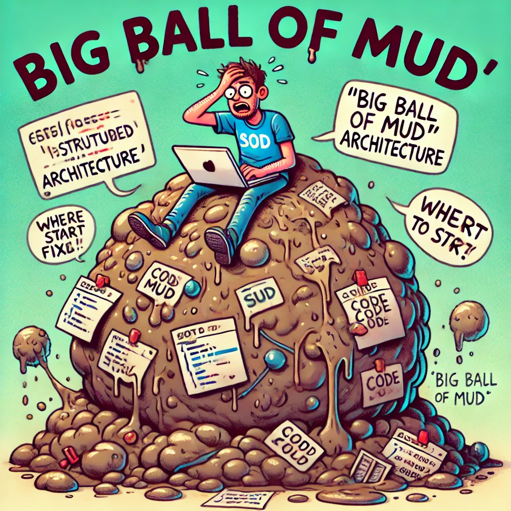 "Big Ball of Mud"라는 표현은 브라이언 풋(Brian Foote)와 조셉 얀돈(Joseph Yoder)이 쓴 유명한 논문 “Big Ball of Mud”에서 비롯되었습니다. 이들은 많은 실제 소프트웨어 시스템이 우아한 아키텍처를 갖추지 못한 채 뒤범벅 상태로 운영되고 있음을 지적하며, 이를 ‘Big Ball of Mud’라 비유했습니다.