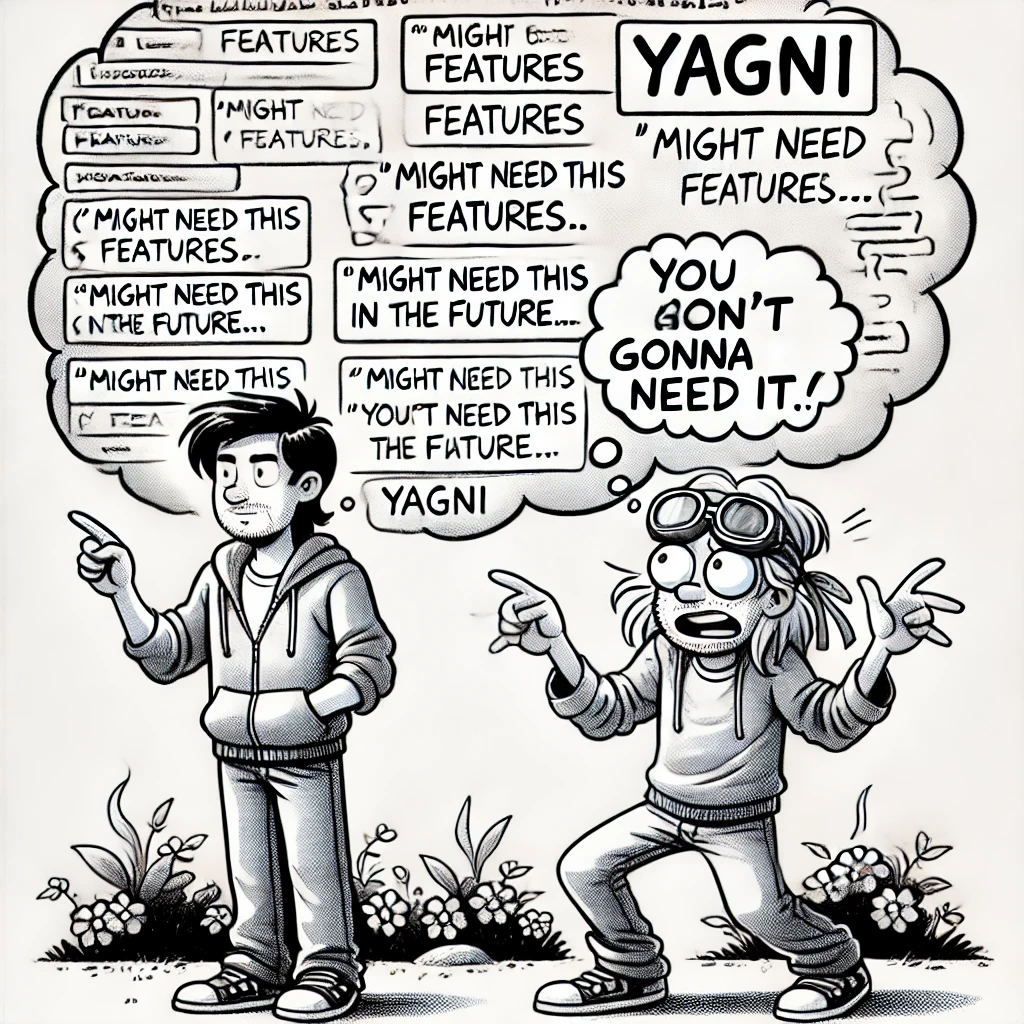 → *"We don’t need that encryption feature upfront—YAGNI suggests we only build what we need now."* - "이 함수에 불필요한 매개변수를 추가하지 마. 나중에 필요할 것 같아도 YAGNI를 기억해."