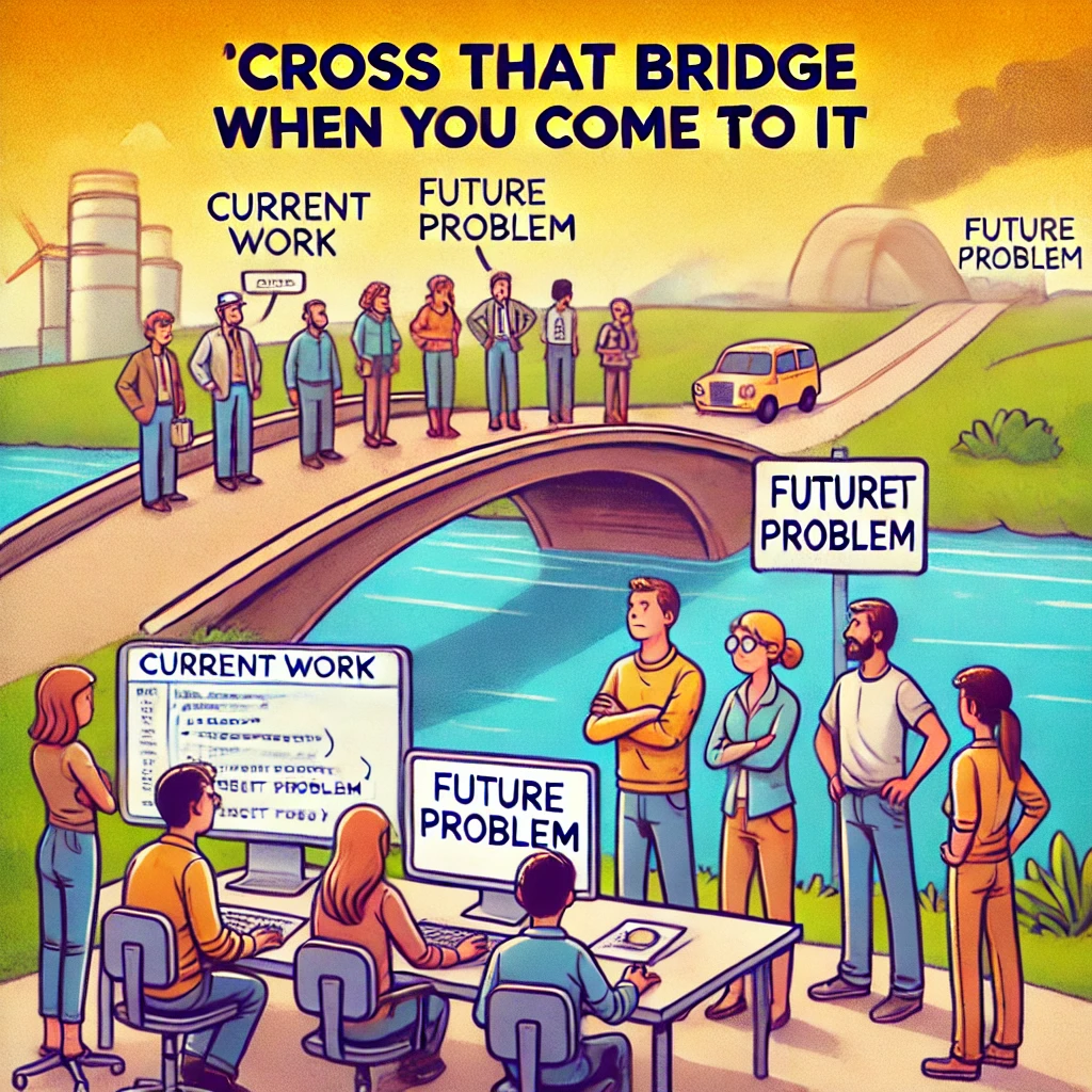 이번에 소개할 표현은 "Cross That Bridge When You Come to It"입니다. 이 표현은 미리 걱정하지 말고, 문제가 실제로 닥쳤을 때 해결하자는 의미로, 소프트웨어 개발에서 예측하지 못한 문제나 걱정을 지나치게 미리 논의하지 말자는 태도를 나타낼 때 자주 사용됩니다.
