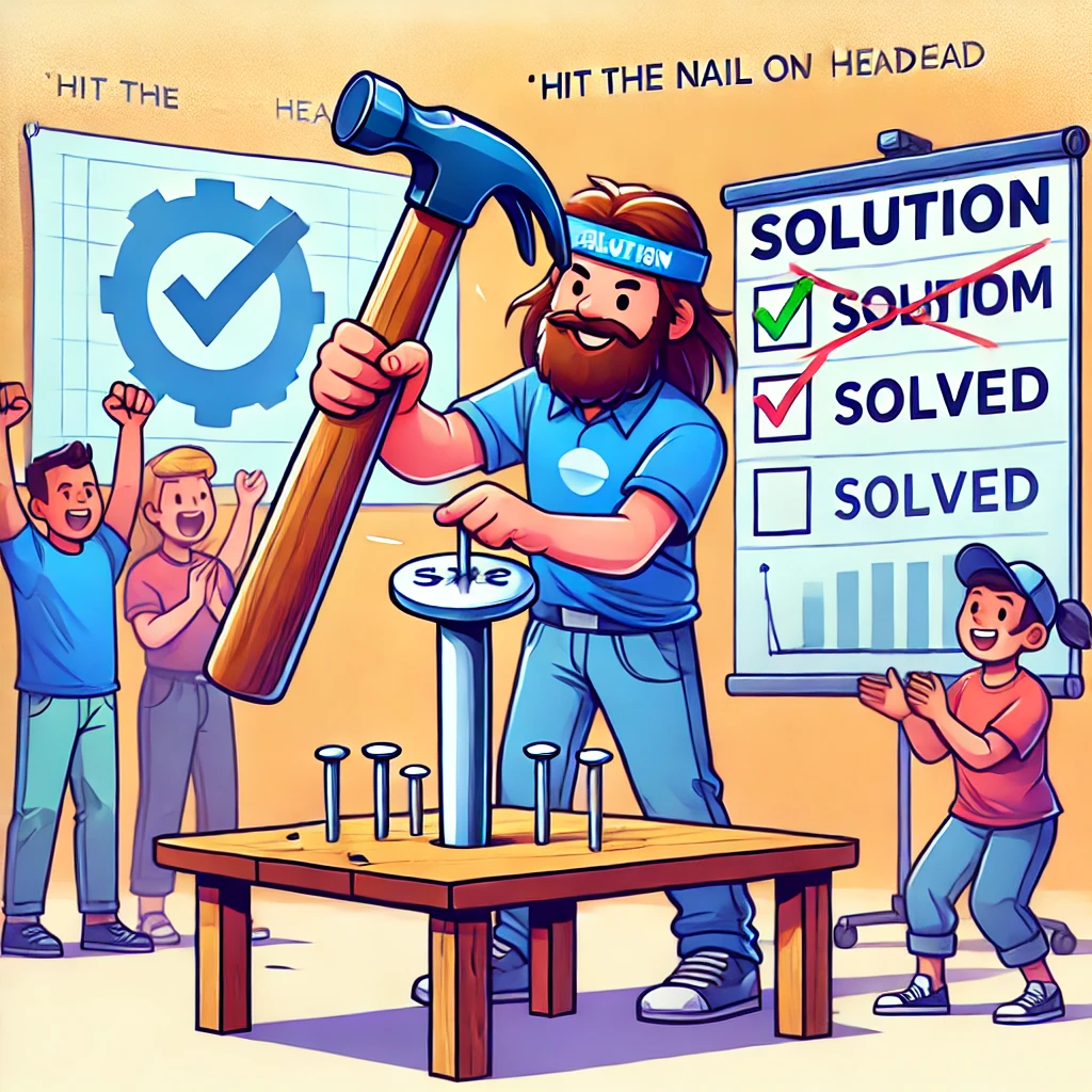 이번에 소개할 표현은 "Hit the Nail on the Head"입니다. 이 표현은 문제의 핵심을 정확히 지적하거나, 완벽하게 맞는 해결책을 제시하다는 의미로, 소프트웨어 개발에서 정확한 분석이나 적절한 해결책을 설명할 때 자주 사용됩니다.
