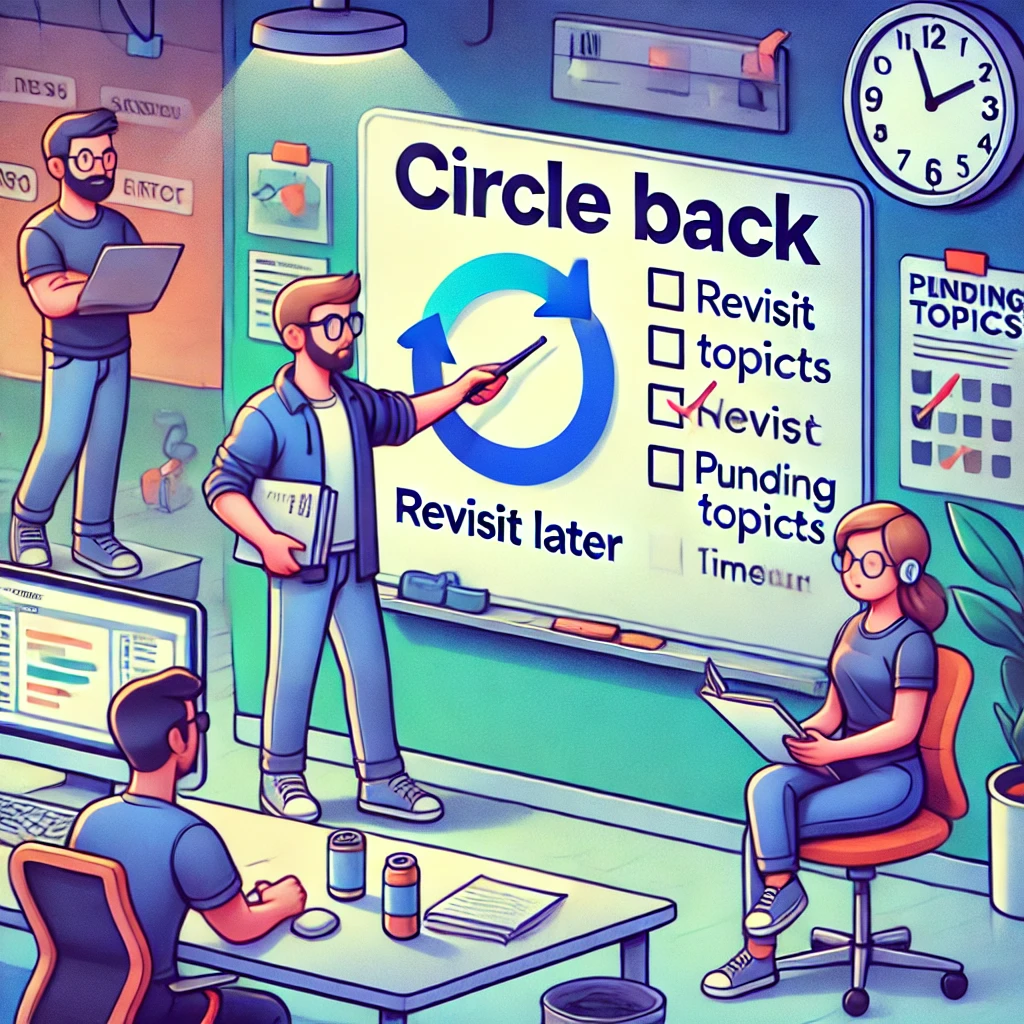 "Circle Back"은 소프트웨어 개발에서 팀이 논의를 체계적으로 관리하고, 우선순위를 설정하며, 적절한 시점에 중요한 문제를 다시 다루는 데 유용한 표현입니다. 이 표현을 활용해 팀의 논의와 작업 관리 효율성을 높이고, 효과적인 협업 문화를 만들어 보세요.